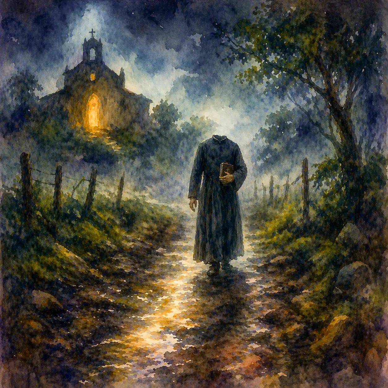 Aparece en los caminos que van a las iglesias viejas, esas de tapia de adobe y campanario chueco. Lo ven a media noche, cuando el pueblo ya apagó las luces y solo queda el ladrido lejano de un perro que ni él sabe a quién le ladra. Viene caminando despacio, con la sotana negra hasta los tobillos, el breviario abierto en una mano, y la otra mano como si fuera buscando algo en el aire. Algo que antes tenía y que ya no tiene.